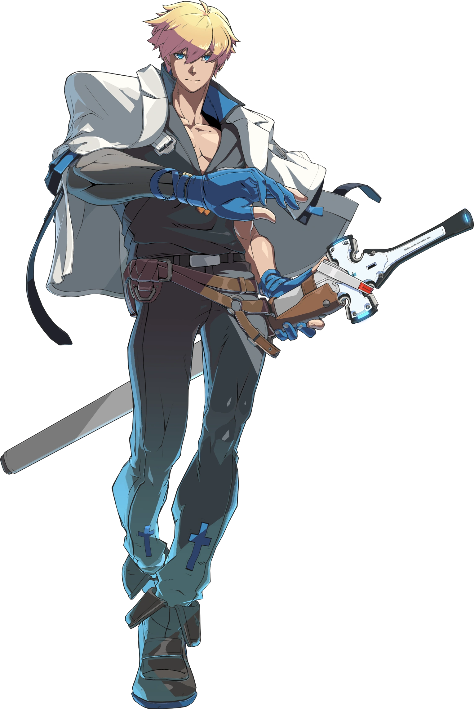 En Overture, luce en cambio un elaborado abrigo largo enrollado con dos cinturones grandes y una capa azul, manteniendo su combinación de colores. En Strive, su atuendo consiste en pantalones simples de color azul oscuro y botas de color marrón oscuro, una camisa azul oscuro con cuello en V de una sola manga con solapas, una chaqueta blanca con forma de capa sobre los hombros y guantes azules con placas de metal en el dorso. Adjunto a sus cinturones marrones hay una vaina en la que guarda el Thunderseal envainado. Tanto sus atuendos en Xrd como en Strive tienen la frase "Nada se puede hacer sin esperanza" y el símbolo de Illyricum en todas partes.