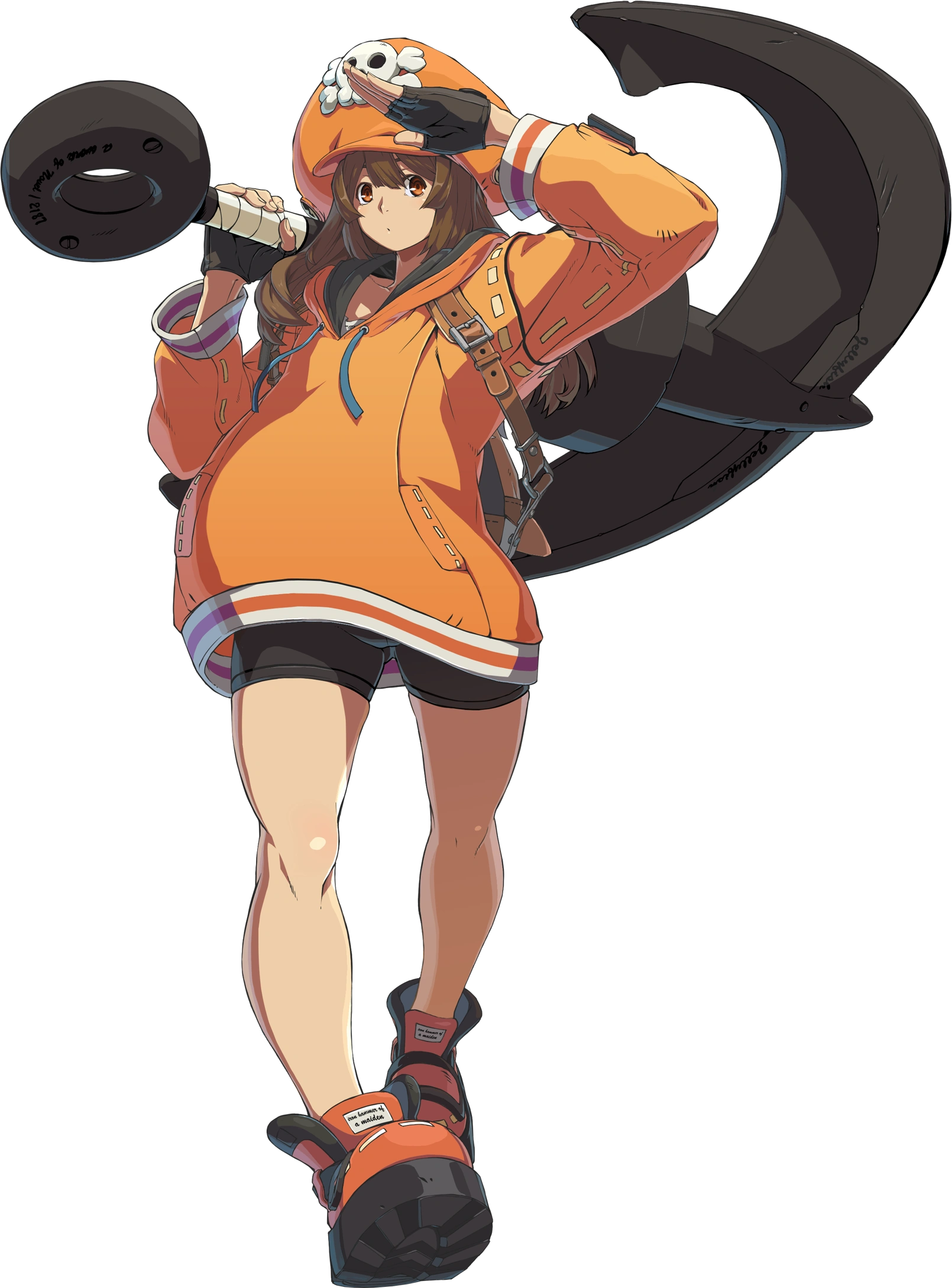 En Strive, mantiene sus guantes sin dedos, botas y su característico sombrero de pirata naranja, pero ahora usa una sudadera con capucha naranja y pantalones cortos de lycra negros, y lleva una mochila beige con el tema de Chimaki.
